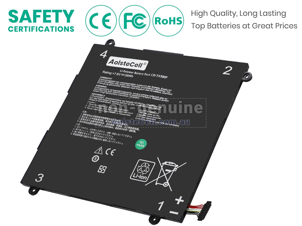 There's no need to worry about the make or model of your device when you buy Asus C21-TX300P replacement battery from AolsteCell, as we have over 100 brands and 700,000 models to choose from. Our batteries are carefully designed and crafted, pass rigorous quality tests, and are recognized by consumers in the Australian market, which means we can provide you with the highest quality and most reliable experience possible.
